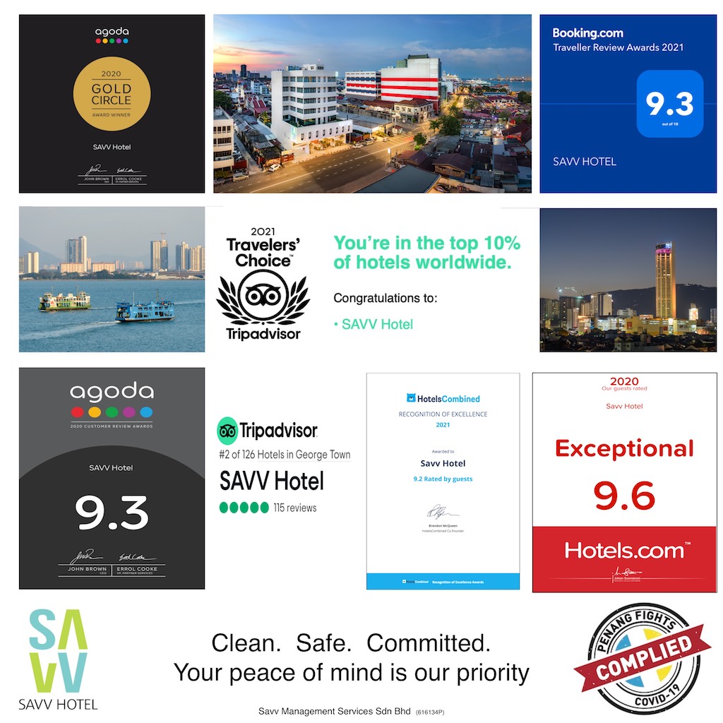 Savv Hotel is conveniently located within the UNESCO World Heritage Site of Georgetown. We are situated right at the city waterfront overlooking the Clan Jetties with easy access to Penang famous local street food, historical sites, street arts, diverse architecture, quaint cafes and bars, all within walking distances.